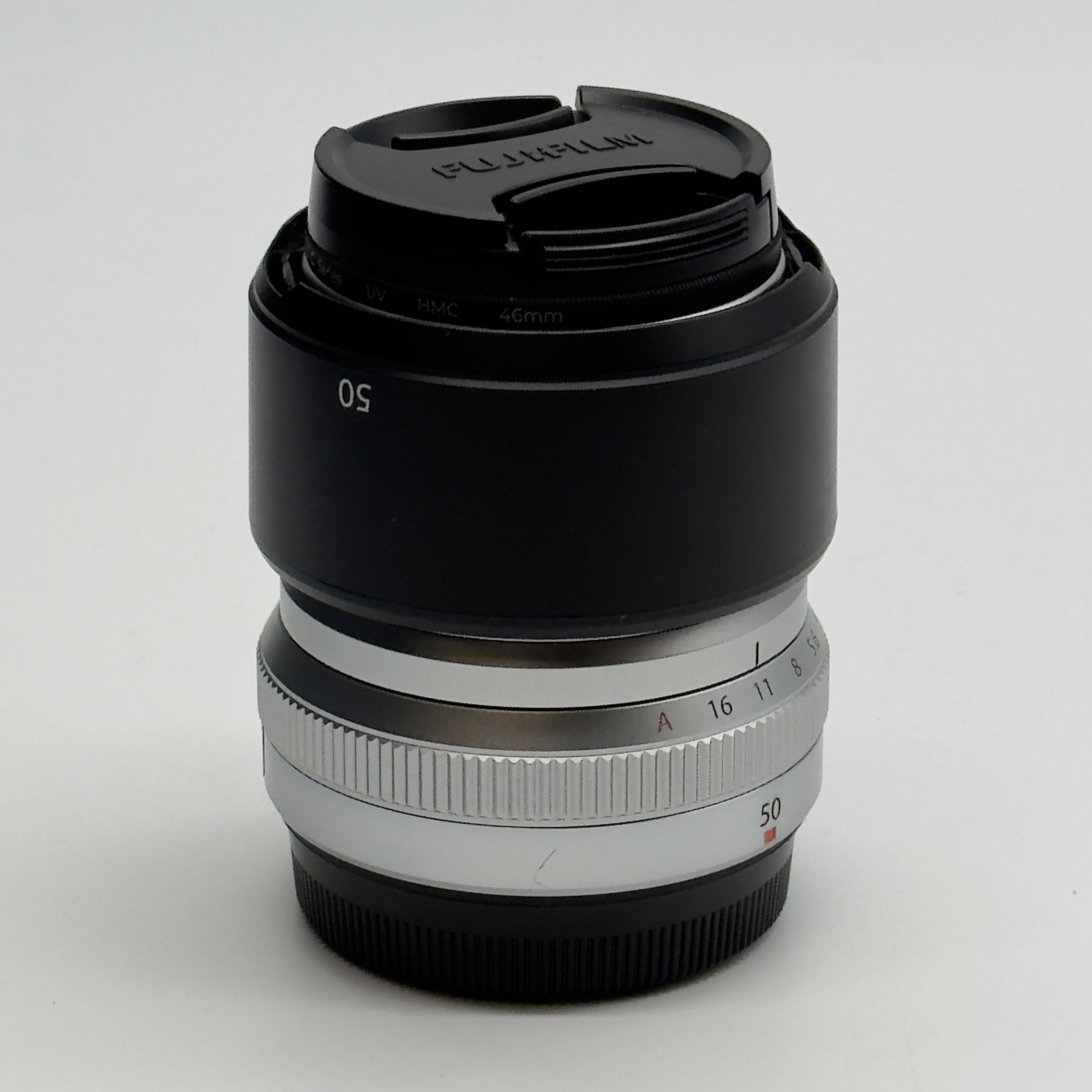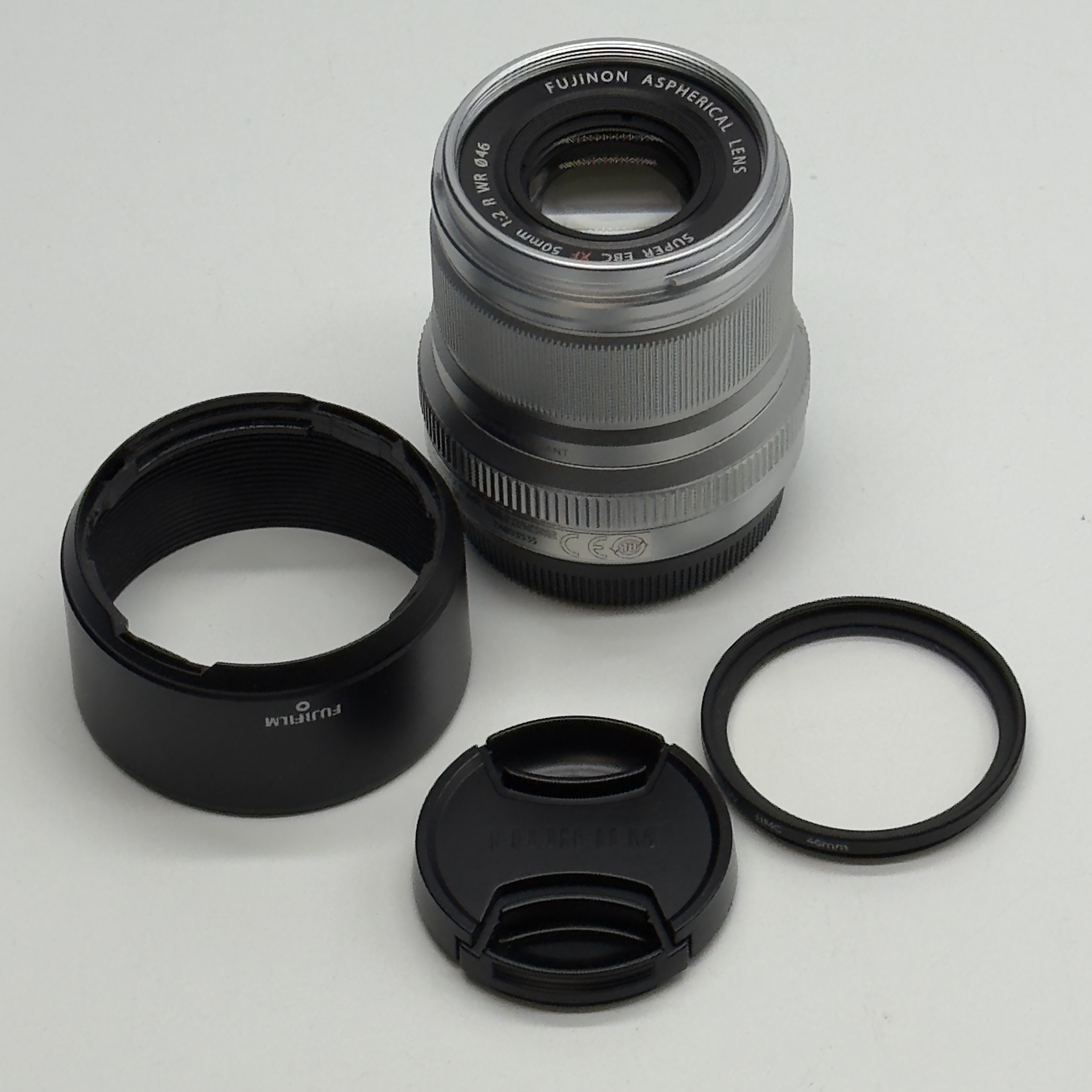 Zestaw zawiera: obiektyw Fujifilm XF 50 mm f/2 R WR (srebrny), dekiel przedni i tylny, osłonę przeciwsłoneczną, filtr UV oraz oryginalne opakowanie.
